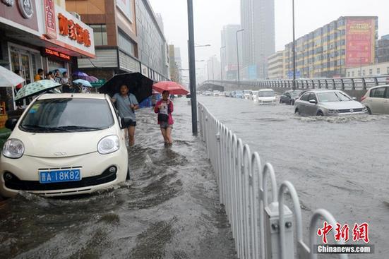 7月19日,山西太原遭遇强降雨天气,城市多处路段内涝严重,民众出行受阻。当日9时28分,山西省太原市气象台将暴雨黄色预警信号提升为暴雨橙色预警信号。预警区域中,部分乡镇过去3小时降水量已达50mm以上,且降水仍将持续。中新社记者韦亮 摄