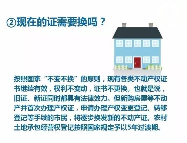 但就权利人的实质影响而言,不动产登记证明只是房产证、国土证等不动产统一后的新证明,可以为入学、就医、出国等作为证明和担保。旧的房产证并非一定要换“新证”。不动产登记机构坚持“不变不换”原则,权利不变动,簿证不更换,依法办理变更、转移等登记工作时,逐步更换为新的不动产登记簿证。