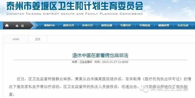 2013年:泰州市某退休老中医,打着“中医世家”称号,未取得《医疗机构执业许可证》,受到卫生行政部门的 行政处罚。