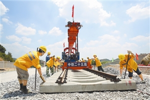 昨天上午,深茂铁路江茂段首组轨排正在进行铺设。