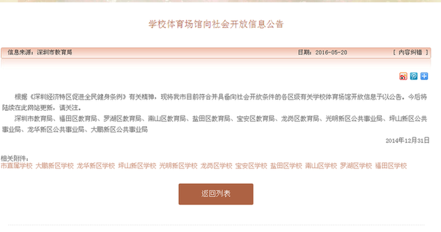 点开深圳市教育局官方网站可以看见,2016年5月20日重新发布了《学校体育场馆向社会开放信息公告》并附送了11个隶属区开放学校的详细地址、联系方式及开放区域与时间段,但落款时间显示为“2014年12月31日”。