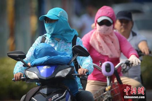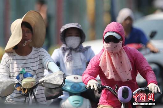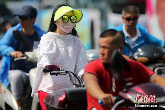 7月25日,“全副武装”的市民骑着自行车在高温下的南京街头经过。当日,中国中央气象台继续发布高温橙色预警,受副高西伸北抬影响,25日至27日,江南、华南、江淮、江汉、黄淮、四川盆地东部、重庆、贵州北部和东部以及新疆南疆盆地等地最高气温可达35-39℃,其中,重庆、江汉东部、江淮中南部、江南中东部等地的部分地区最高气温可达40-41℃。中新社记者 泱波 摄