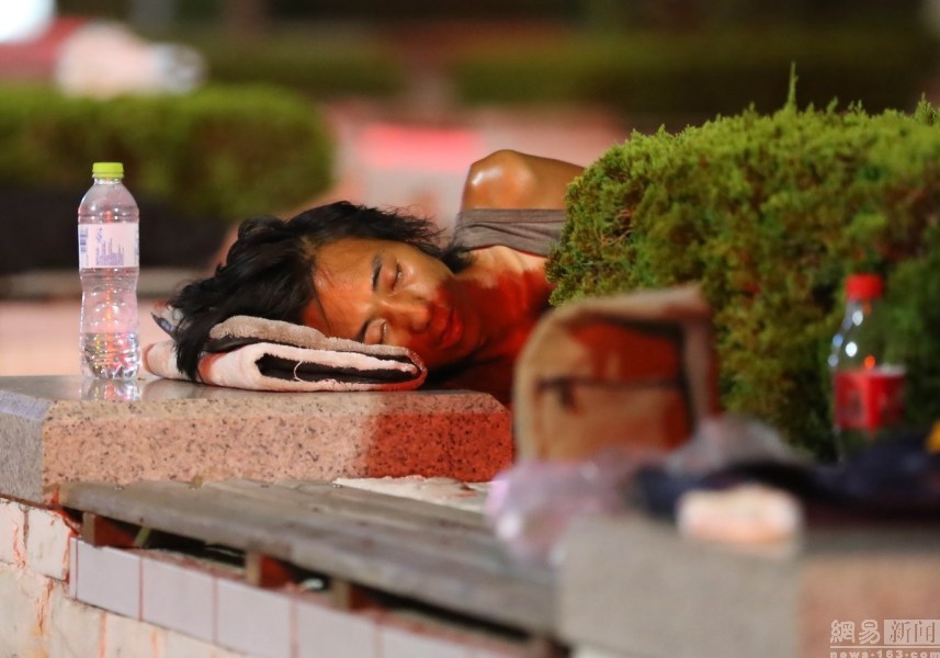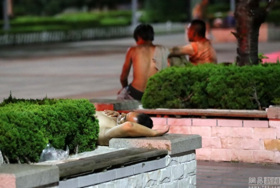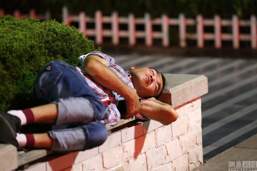 2016年7月26日,山东省潍坊市,“露宿者”在潍坊火车站广场席地而眠。东方IC供图