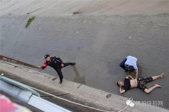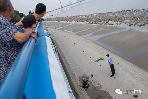 男子躺的地方紧贴着堤坝,需要趴在栏杆上探出身才能看到,垂直落差六七米,很难被人发现。现场人员猜测他有可能是从栏杆上坠下的,且很有可能受伤,于是马上联系了110和120。民警和120急救人员赶到现场后,在上面向他喊话。