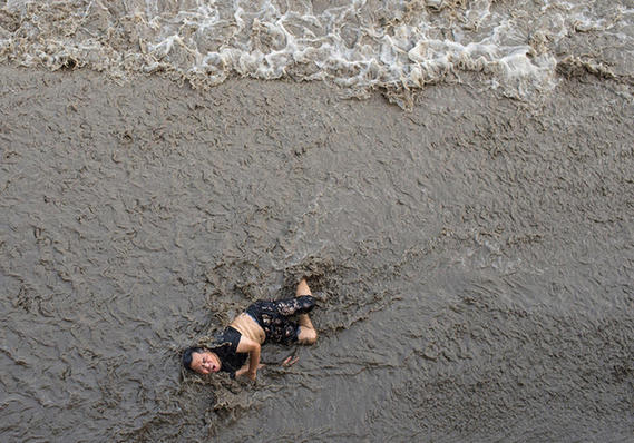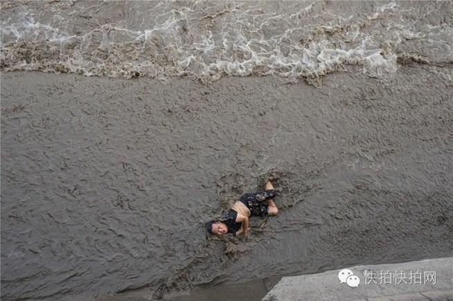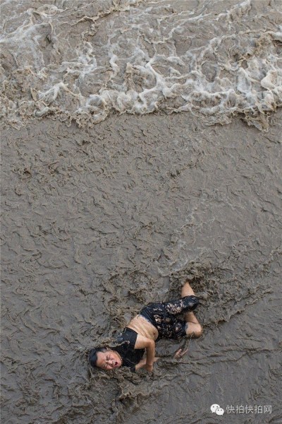 潮水冲上江滩后,白色潮头从他身旁擦肩而过,只是回头潮涌上了江滩,将他推出去几米外。