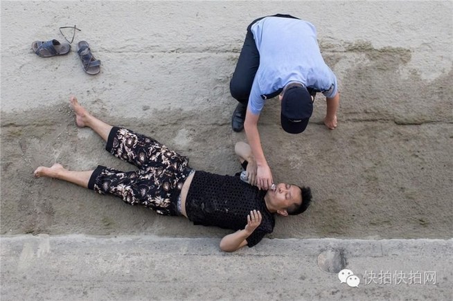 7月25日下午,钱塘江畔,上演了的惊险一幕,一名男子昏迷在远处江堤底下的水泥岸上。他四十岁左右,穿着深色短袖短裤,脚上一双黑色凉鞋,面色发白,旁边地上还有一瓶矿泉水和一副眼镜。