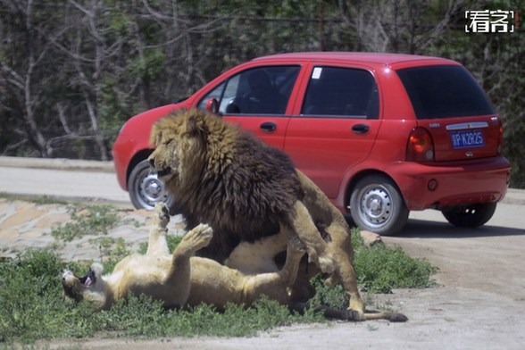 一般而言,野生动物园会提供游览车,但若在院内选择“自驾游”,车辆受到损害,园区概不负责。图为2012年5月12日,北京八达岭野生动物园内,公狮子与母狮子在嬉戏。京华时报/东方IC