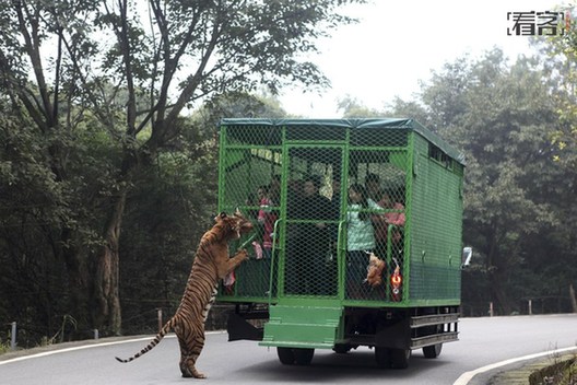 图为2014年12月30日,重庆野生动物园,游客被“关”进游览车的笼子里让猛兽来观看,近距离接触猛兽,感受它们的野性。车上的游客被吓得尖叫连连。视觉中国供图
