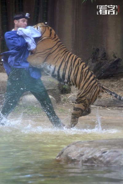 当地时间2013年11月26日,澳大利亚阳光海岸,一只苏门答腊虎突然跳起袭击了动物园管理员Dave Styles,致其头部和肩部重伤。东方IC