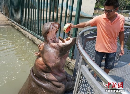 7月26日,无锡动物园的工作人员一早就为该园的动物们安全度夏做准备,遮阳网、空调、电扇、喷淋、冰块、水果冰坨等“清凉”物品一应俱全。面对高温来袭,动物们度夏、防暑也是各有“凉方”,这些动物们有的泡在水里、有的躲在树荫下、有的则抱着冰块降温。据无锡气象部门消息称,受强盛的副热带高压控制,今天无锡最高温度达到了39.1℃。预计29日前,39℃左右的高温天气还将维持,城区最高温度在40-41℃之间。图为工作人员在喂食河马西瓜。孙权 摄