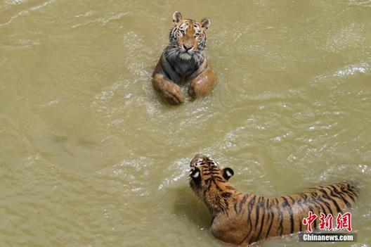 7月26日,无锡动物园的工作人员一早就为该园的动物们安全度夏做准备,遮阳网、空调、电扇、喷淋、冰块、水果冰坨等“清凉”物品一应俱全。面对高温来袭,动物们度夏、防暑也是各有“凉方”,这些动物们有的泡在水里、有的躲在树荫下、有的则抱着冰块降温。据无锡气象部门消息称,受强盛的副热带高压控制,今天无锡最高温度达到了39.1℃。预计29日前,39℃左右的高温天气还将维持,城区最高温度在40-41℃之间。图为老虎们戏水避暑。孙权 摄
