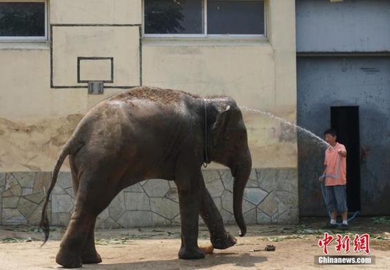 7月26日,无锡动物园的工作人员一早就为该园的动物们安全度夏做准备,遮阳网、空调、电扇、喷淋、冰块、水果冰坨等“清凉”物品一应俱全。面对高温来袭,动物们度夏、防暑也是各有“凉方”,这些动物们有的泡在水里、有的躲在树荫下、有的则抱着冰块降温。据无锡气象部门消息称,受强盛的副热带高压控制,今天无锡最高温度达到了39.1℃。预计29日前,39℃左右的高温天气还将维持,城区最高温度在40-41℃之间。图为无锡动物园员工给大象冲澡。孙权 摄