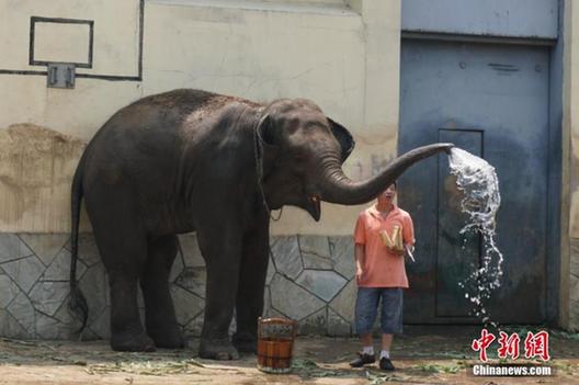 7月26日,无锡动物园的工作人员一早就为该园的动物们安全度夏做准备,遮阳网、空调、电扇、喷淋、冰块、水果冰坨等“清凉”物品一应俱全。面对高温来袭,动物们度夏、防暑也是各有“凉方”,这些动物们有的泡在水里、有的躲在树荫下、有的则抱着冰块降温。据无锡气象部门消息称,受强盛的副热带高压控制,今天无锡最高温度达到了39.1℃。预计29日前,39℃左右的高温天气还将维持,城区最高温度在40-41℃之间。图为大象洗完澡开心地喷水。孙权 摄