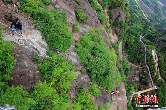 黄桂平在同伴的配合下走向悬崖峭壁。