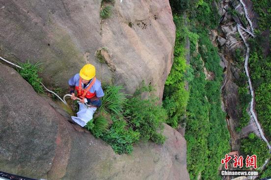 5月1日,正值五一劳动节,湖南平江石牛寨迎来出游高峰,但悬崖边被游客随手丢弃的垃圾让环卫工黄桂平头疼。当日,黄桂平身系安全绳在石牛寨的悬崖峭壁处捡垃圾,而他的劳动也成为了游客眼中另一道风景。