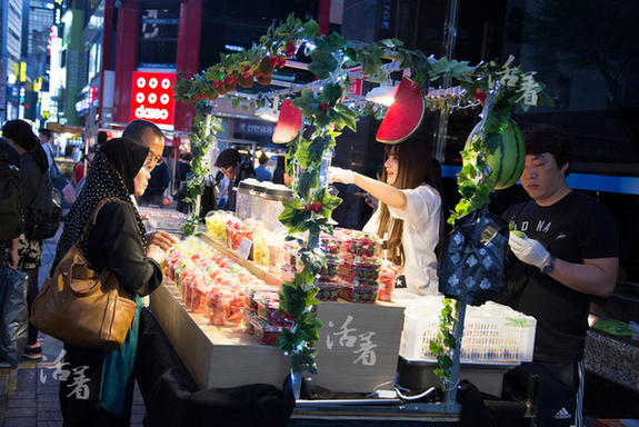 在汉阳大学读语言的宋冰倩(中)也加入到打工者的行列。她在明洞夜市销售水果和鲜榨果汁。她的韩国老板在明洞夜市拥有四个这样的果汁摊位,雇佣了4个来自中国的留学生。来明洞夜市的中国游客特别多,懂中文又通韩语的中国留学生在这里打工非常普遍。