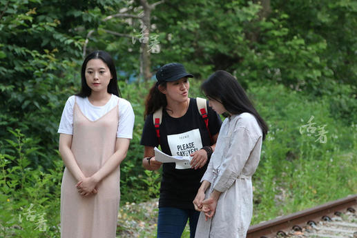 电影系学生孙琳(中)正在日以继夜地拍摄自己的毕业作品,78小时只睡了7小时。建国大学表演系的中国留学生胡梦珊(左)担任女主角。曾有传闻说建国大学的韩国学生上街游行抗议不公正的奖学金制度,后来建国大学迫于压力做了调整。胡梦珊说她并没有听说过抗议事件,但她证实了现在建国大学中韩学生的奖学金标准是一样的。