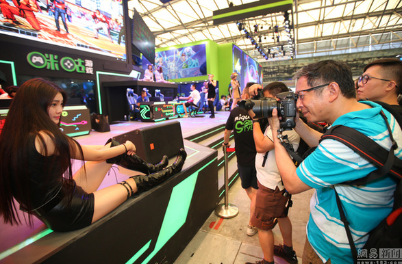 李晓璇说,ChinaJoy场馆内由于观众人流量大,环境闷热,嘈杂,为吸引人气,展商要求showgirl们时刻摆好造型露出微笑面对摄影爱好者们的“长枪短炮”,每次休息的间隙,除了为自己迅速补妆外,更多的则是不停地按摩脸部已微笑到僵硬的肌肉。图为2016年07月30日,上海,现场观众为李晓璇拍照。阿德/视觉中国