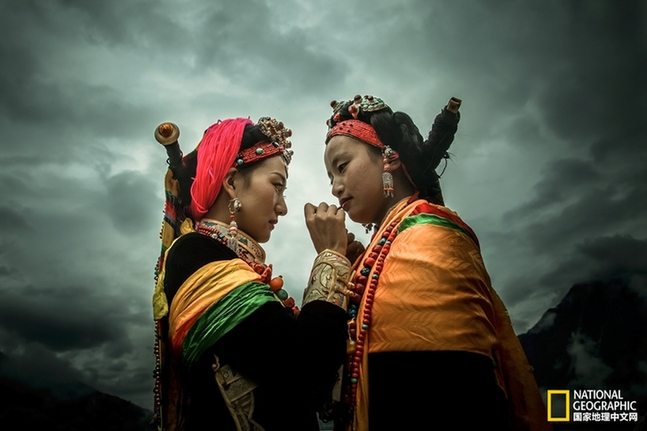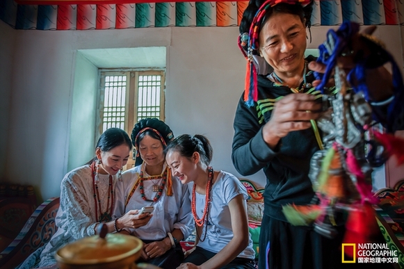 泽仁拉姆和表妹在给负责梳头的婆婆看自己用手机拍的碉楼照片,母亲在一旁喜悦的整理银饰,这一时刻女孩子需要一身盛装。