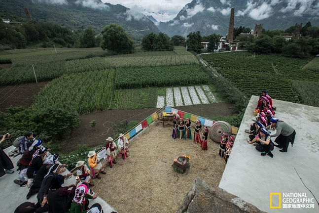 装扮一新的女孩与母亲一起赶往成人礼地点。远处古朴的碉楼保佑东女国的子孙幸福安康。