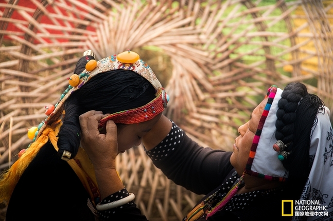 传承人在整理姑娘的装束,梳妆头饰是成人礼最重要的环节。