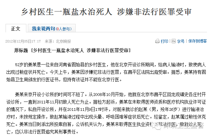 河南省乡村医生私开小诊所一瓶盐水致患者过敏死亡。