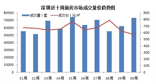 受豪宅拉动作用减弱的影响,深圳新房市场成交价连跌三周,7月成交均价跌至56720元/㎡,环比下降8.2%。家家顺监测数据显示,从近十周成交量价走势来看,前5周基本保持量价平稳上升的趋势。到了7月份,各周成交量呈现V字型,除了7月初受6月“地王”翘尾因素影响小幅拉升外,第二周跌入谷底,往后慢慢回升,但始终未能突破,7月新房成交2984套,环比下降8.3%。成交价却出现小幅倒V型,在7月第二周的时候价格有小幅拉升,此后一直回落。