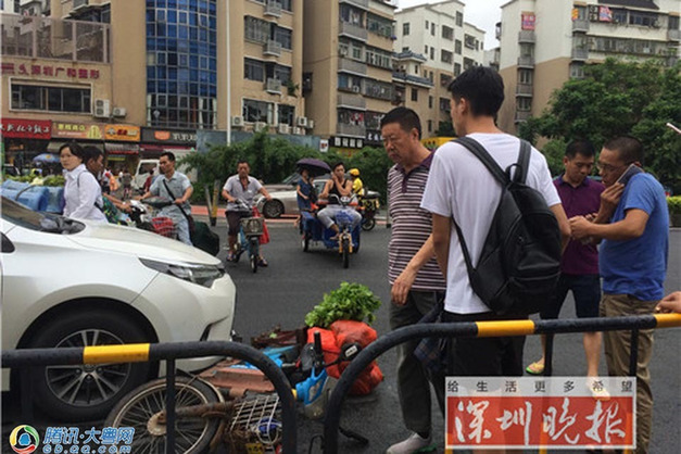 昨日(8月3日)下午5点左右,林先生骑电动车穿过莲花路与景田东路的十字路口时,被一辆汽车“拦腰”撞到,所幸无人员伤亡。记者现场看到,林先生的电动车被一辆白色小车撞翻在地,后座还绑着几捆青菜。“我就在景田市场开汤粉店,每天去进货都会经过这个路口,已经五六年了,没想到今天会遇到这种事。”林先生表示非常郁闷,“但好在人没事”。