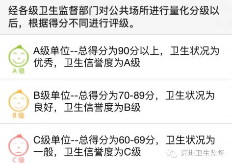 深圳市公共场所卫生信誉度等级分为A、B、C三个等级,等级越高表示卫生状况越好,其中A级为 优秀,B级良好,C级为一般。