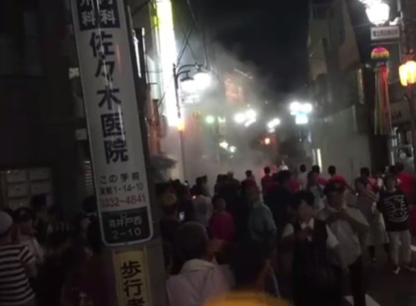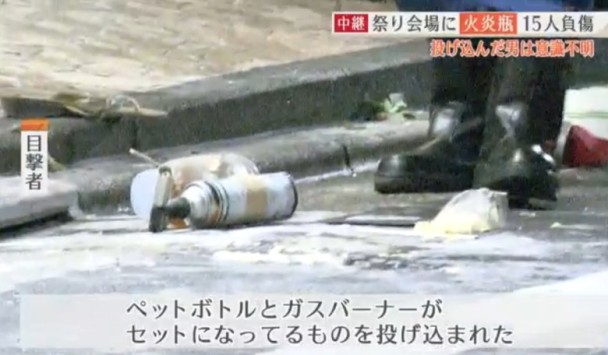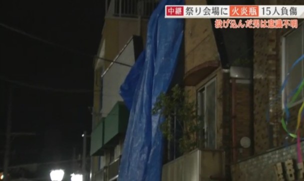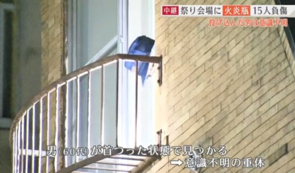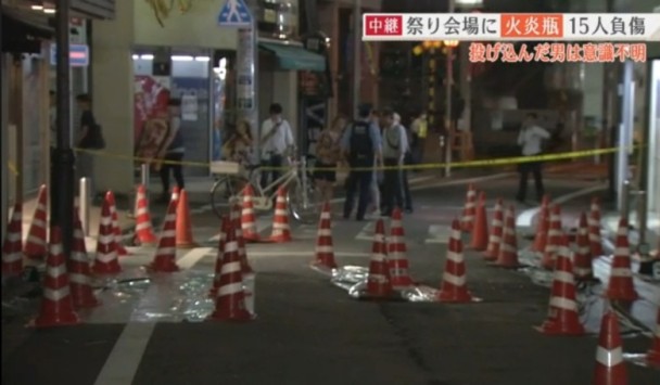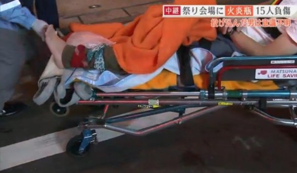 2016年8月7日,日本东京,杉并区商业街举行庆典巡游期间,有人从高处朝人群扔下多个燃烧瓶,导致至少15人受伤,警方正从杀人未遂的方向调查。施袭者据报是一名68岁老人,在行凶后自杀身亡;当地传媒引述疑凶的邻居称,疑凶自去年丧妻后心情抑郁,或因不堪庆典的噪音滋扰而行凶。