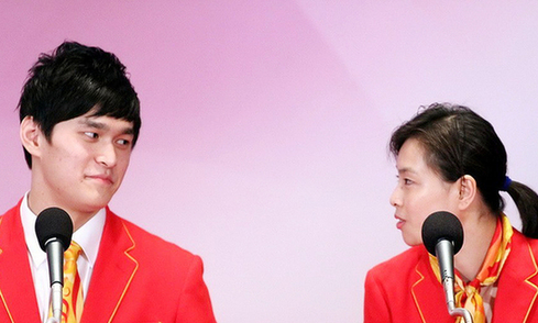 2012年伦敦奥运会夺冠后,吴敏霞出席冠军活动,与游泳冠军孙杨低声交流。
