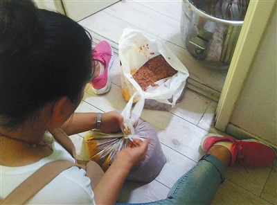 7月10日,北京某小区“某灌汤蒸饺”,老板娘将刚碎好的肉馅装进塑料袋。