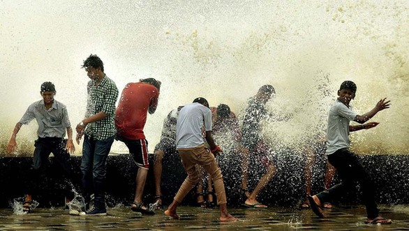 人们争相避让壮观的潮涌。