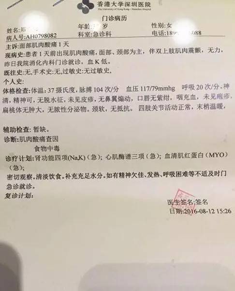 发现症状后,8月11日中午,王小姐、郑小姐先与火锅店电话联系沟通描述症状,而后又到火锅店与负责人交涉无果后,两人先后到香港大学深圳医院、深圳市中医院检查,表现出疑似食物中毒、急性肠胃炎症状。