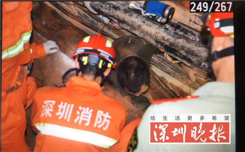 13 日晚,该处电缆沟正在整修,电缆沟靠近马路一侧发生垮塌,两人被埋。事发地点距离罗湖区消防大队田贝中队不远,消防队员在接警后几分钟内便到达现场。田贝中队副中队长陈坚辉告诉记者,当时一名施工工人已被同伴救出,另外一名工人则仍然还困在电缆沟内。" 当时被困男子身处一米深的沟渠内,身子被倒塌的石块、泥土困住 ",陈坚辉说,男子头顶上还有胳膊粗的高压电缆压着,大概有四五根,由于担心高压电缆漏电导致二次伤害,消防官兵边通知供电部门断电,边安排人员带绝缘手套开展救援。