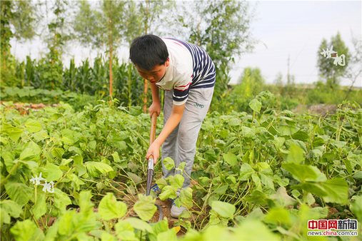做了面条吃了中午饭,刘宇扛着锄头下了黄豆地锄草,这也是他每次回来必须要做的事情。