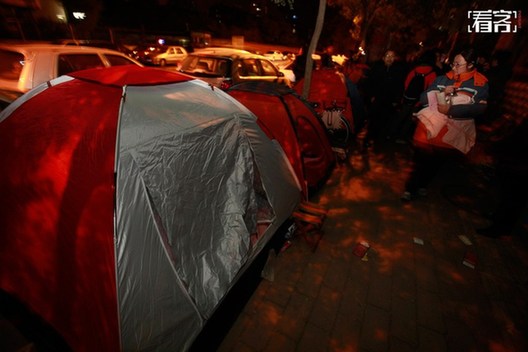 图为2015年5月23日,北京丰台区家长排队抢小区内幼儿园100个名额,为了能让孩子上离家最近的幼儿园,一些家长已经连续排了五天五夜的队。法制晚报/视觉中国