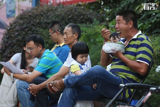 图为2016年7月25日,昆明,安宁市第二幼儿园贴出招生通知后,引来家长排队领号,家长边就餐边排队守号牌。冰清/视觉中国