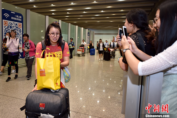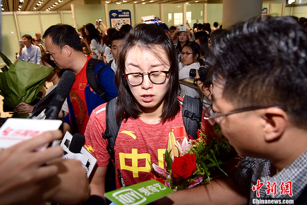 北京时间8月16日清晨,里约奥运中国游泳队回国抵达北京机场,傅园慧、宁泽涛等游泳选手被媒体和粉丝包围。图为傅园慧抵达首都机场。中新网记者金硕 摄