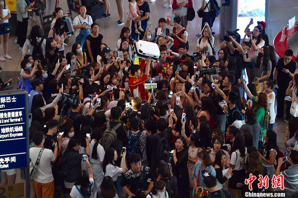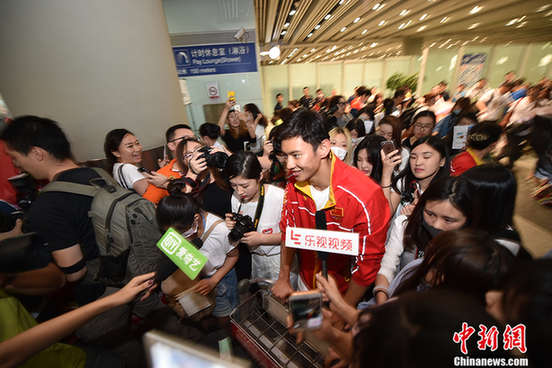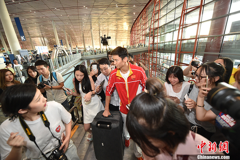 北京时间8月16日清晨,里约奥运中国游泳队回国抵达北京机场,傅园慧、宁泽涛等游泳选手被媒体和粉丝包围。图为宋泽涛抵达首都机场。中新网记者金硕 摄