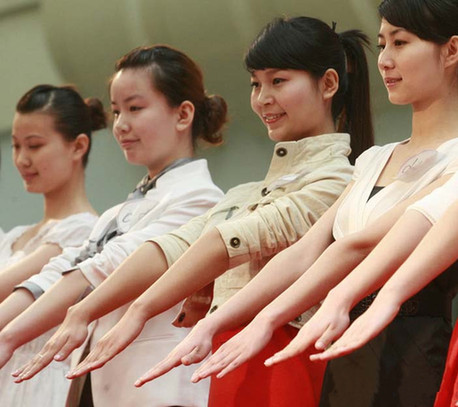 姑娘们伸出双手尽量展示出自己最美好的一面。