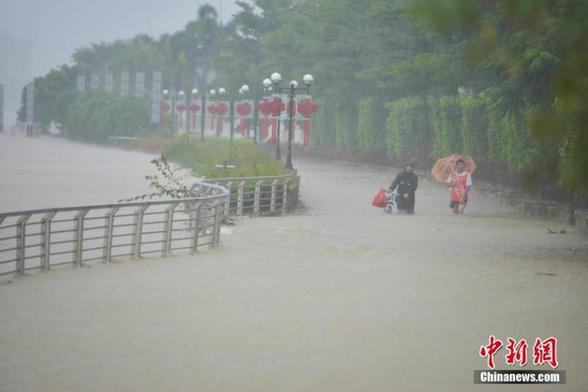 8月18日,2016年第8号台风“电母”给海南带来强暴雨天气,致海南省多市县出现严重内涝。在海南西部的临高县大部分道路积水严重,车辆无法通行,穿县城而过的文澜江滚滚洪水漫过江堤,低洼路段已被洪水吞没。图为海南省临高县市民冒险在洪水淹没的江堤行走。中新社记者 骆云飞 摄
