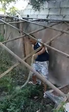 这时,阿宝面对蟒蛇半跪下来,快速抖动手里的塑料袋。每一次蟒蛇扑咬,阿宝就把塑料袋提高一些。几次下来,蟒蛇有点累了,动作变慢,阿宝趁机抓住蟒蛇的七寸,把蟒蛇缠在手上带了出来。