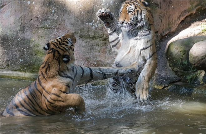 据英国《每日邮报》报道,近日,在德国纽伦堡的一家动物园里,两只一岁大的西伯利亚幼虎兄弟一言不合就在水中打起架来,它们抓挠对方的脑袋,甚至互扇耳光,池中水花四溅,小小年纪就展现出了森林之王的勇猛。当地的业余摄影师彼得-维曼拍下了这一有趣的场景。(转载请注明出处,更多精彩内容请关注腾讯国际新闻微信公众号“糖醋国际”。)