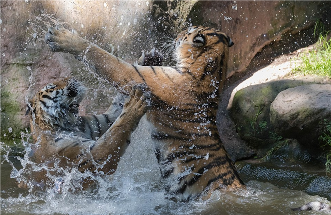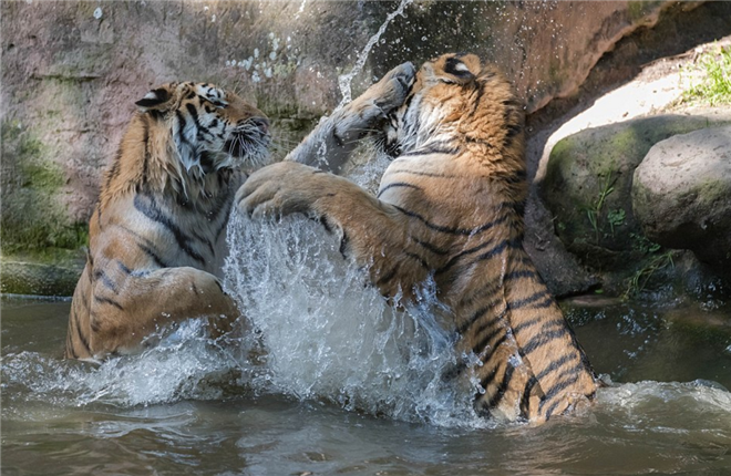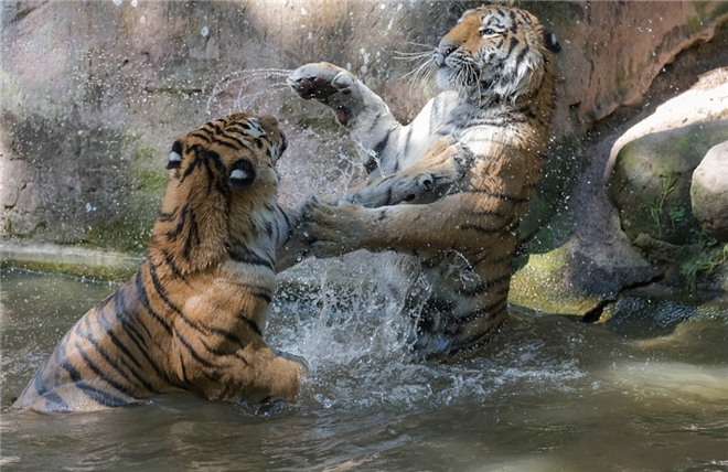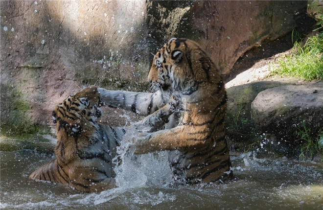 在这组照片中,两只虎仔轮番击打对方的脑袋,难分胜负。而且兄弟俩看上去都没有要屈服的样子。虎仔们在打斗中激起一池水花,这让场面更显壮观了。