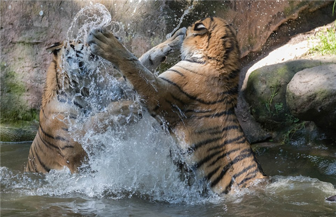 其中一只虎仔从水池里高高跳起,用后腿站立着,从上方攻击另一只虎仔,被击中头部的虎仔倒在水里。