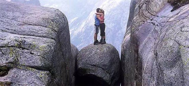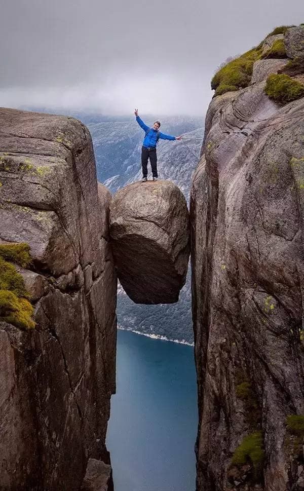 这块名为Kjeragbolten的巨石位于挪威南部罗加兰郡的谢拉格山Kjerag中海拔3500英尺的地方,堪称大自然的鬼斧神工,被誉为挪威的奇迹之石。站到这上面来,有放下一切的感觉。