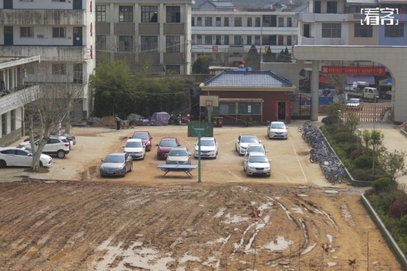 正规停车场的缺乏,导致了其他公共空间被停车占用。图为2015年3月18日,江西省上饶市,小学篮球场停10辆该校教职员工的私家车。球场成了停车场。视觉中国