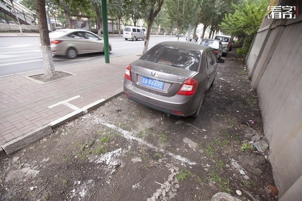2016年7月31日,长春市长沈路附近,喷涂的停车位,直接用油漆喷涂在了路边的绿化带上,汽车直接停在了上面。视觉中国