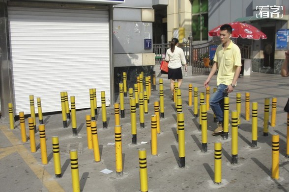 2015年6月11日,广东省深圳市,宝安区一处路面设置了70多条路桩,防止乱停车。视觉中国